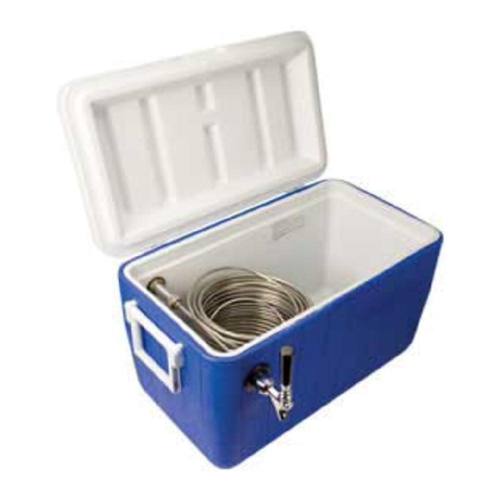 The Micro Matic CB481B Jockey Box Coil Cooler is an essential tool for beverage dispensing, particularly in outdoor events and catering environments. With its 48-quart capacity, this cooler is designed to efficiently cool beverages using its durable coil system, which features a 100/20 ft coil length. The coil's dimensions include a 3/8" primary size with a 1/4" choke, ensuring optimal flow and cooling performance. This model is equipped with a single faucet, shanks, and ice box coupler assemblies, providing a complete setup for immediate use. Its robust construction is complemented by heavy-duty side handles, facilitating easy transport and handling. The cooler's 95-degree hold-open lid, featuring a snap-lock child safety latch, ensures secure access and operation. Additionally, the recessed drain plug aids in effortless drainage and maintenance. The cooler's distinctive blue exterior not only adds aesthetic appeal but also identifies it readily in a busy setting. The Micro Matic CB481B Jockey Box Coil Cooler is a versatile and reliable choice for professionals in the beverage service industry, offering a combination of capacity, convenience, and safety for efficient operations.