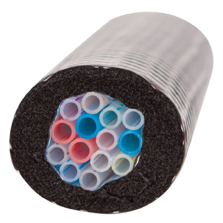 The Micro Matic CDI1244-BF Barriermaster Flavorlock Trunk Line 1/4" I.D. (12) Products with (4) Glycol Lines is a precision-engineered solution tailored for the beverage dispensing industry, particularly suitable for bars, restaurants, and breweries. This advanced trunk line system features a 1/4" inside diameter, enabling efficient and consistent beverage flow. It supports up to twelve different products, allowing for a diverse selection of beverages to be dispensed from a single system. The inclusion of four glycol lines ensures that beverages are maintained at optimal temperatures over long distances, enhancing the quality and taste of each pour. The trunk line is constructed with color-coded tubing, which simplifies installation and maintenance by clearly distinguishing between different beverage and glycol lines. An aluminum foil cold transfer wrap encases the trunk line, providing superior thermal insulation to sustain the cold chain from storage to glass. This feature-rich product is NSF certified, affirming its compliance with stringent public health and safety standards, making it a reliable choice for establishments aiming to deliver high-quality beverages with efficiency and precision. The Micro Matic CDI1244-BF is a comprehensive solution designed to meet the varied demands of the beverage industry with reliability and ease.