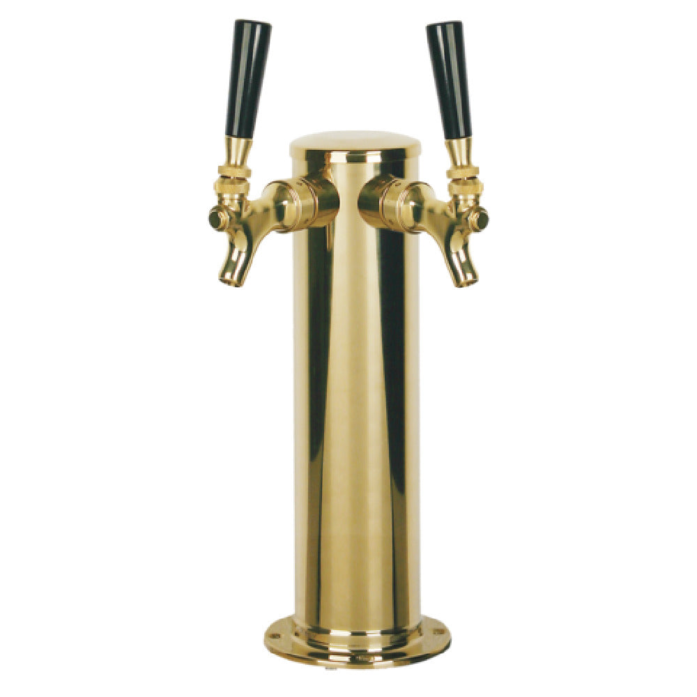 The Micro Matic D4743DT-PVD Column Draft Beer Tower Countertop 3" Dia. X 12"H is an expertly crafted solution for serving draft beer, suited for a variety of industry segments. Designed with a 3-inch diameter and standing at 12 inches high, this draft beer tower is air-cooled and features two brass faucets, providing a classic and durable dispensing system. Although faucet handles are not included, the tower allows for a 9-1/4 inch faucet clearance, facilitating smooth pouring operations. The 4-1/2 inch diameter base ensures stable mounting on countertops, with gaskets and hardware included for easy installation. The tower is constructed from 304 stainless steel, renowned for its strength and corrosion resistance, ensuring long-term reliability. The PVD brass finish not only adds an aesthetic appeal but also enhances durability, making it a sophisticated addition to any bar or restaurant setting. Certified by NSF, this draft beer tower meets rigorous health and safety standards, making it a trusted choice for professional beverage service environments. The Micro Matic D4743DT-PVD Column Draft Beer Tower is an excellent choice for establishments seeking a combination of style, durability, and functionality in their beverage dispensing solutions.