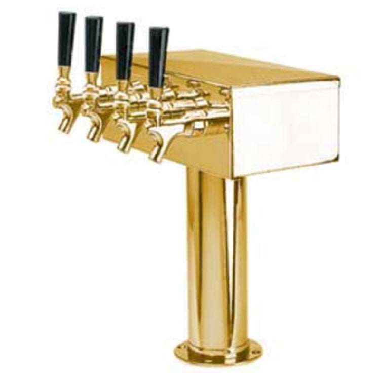 The Micro Matic D7744PVD T Style Draft Beer Tower is a premier countertop solution for dispensing draft beverages with precision and style. Measuring 12 inches wide by 14-3/4 inches high, this beer tower is crafted with an emphasis on both functionality and aesthetic appeal. The unit features a polished PVD brass finish, ensuring durability and an eye-catching metallic gleam that complements any bar setting. It is equipped with four brass faucets, spaced 3 inches on center (OC), allowing for simultaneous pouring of multiple beverages with an 11-1/4 inch faucet clearance for easy glass accommodation. The draft tower is designed with a 3-inch diameter column and a robust 4-1/4 inch diameter base for stable mounting. For installation convenience, mounting gaskets and hardware are provided. This air-cooled system is ideal for maintaining optimal beer temperature and quality, particularly in high-demand environments such as commercial bars, restaurants, and brewery taprooms. The Micro Matic D7744PVD is an excellent choice for establishments seeking to enhance their draft service efficiency while maintaining a sophisticated bar aesthetic. The exclusion of faucet handles allows for customizable options to match diverse service themes and operational needs.
