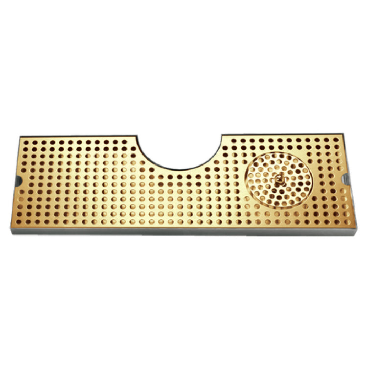 The Micro Matic DP-MET-T-PVD-24GR-Z Drip Tray Trough Surface Mount is a precision-engineered solution for beverage dispensing systems, tailored to meet the diverse needs of bars, restaurants, and breweries. With dimensions of 24 inches in width and 8-1/2 inches in depth, it provides ample space for effective drip management. This drip tray includes an integral glass rinser, certified by NSF, ensuring compliance with public health standards while maintaining optimal hygiene. Crafted with a perforated PVD brass screen, it offers durability and an attractive finish. The tray is designed with a 5/8 inch O.D. drain, facilitating efficient liquid removal and reducing maintenance efforts. A standout feature is its compatibility with the Metropolis "T" draft tower, highlighted by a specific cutout that seamlessly integrates with this system. Constructed from robust stainless steel, the DP-MET-T-PVD-24GR-Z drip tray promises long-lasting performance and resistance to corrosion, making it a reliable choice for high-traffic settings. This product is an excellent fit for industry professionals seeking a balance of functionality, durability, and aesthetic appeal in their beverage service setup. Its thoughtful design ensures it meets the demands of different segment markets within the hospitality industry.