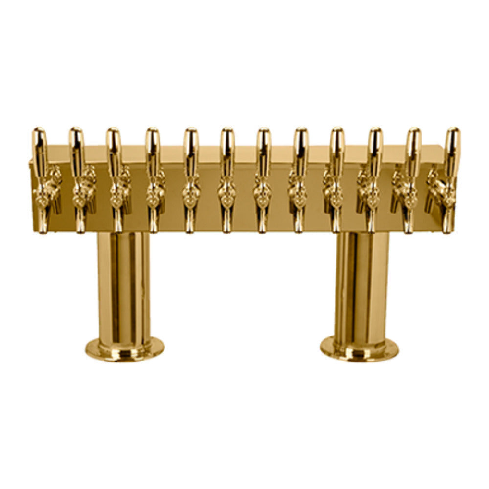 The Micro Matic DPT412PVD-3 Double Pedestal Draft Beer Tower is a meticulously engineered countertop unit measuring 36"W x 15-9/16"H, designed to meet the diverse needs of the beverage industry. This air-cooled system is equipped with twelve brass faucets, which are spaced at 3 inches on center, providing ample capacity for high-demand environments. Notably, the unit features an 11-5/8 inch faucet clearance, ensuring compatibility with a wide range of glass sizes. The draft tower is supported by two robust 4-inch columns, each anchored by 6-inch diameter bases, offering stability and ease of integration into existing setups. Mounting gaskets and hardware are included, facilitating straightforward installation. Its polished PVD brass finish not only enhances durability but also adds a touch of elegance, making it suitable for upscale bars and restaurants. This model is crafted to cater to the specific requirements of various market segments, from large-scale commercial operations to boutique establishments seeking both functionality and aesthetic appeal. The Micro Matic DPT412PVD-3 stands out as a versatile and reliable choice for professionals aiming to deliver a superior draft beer experience to their clientele.