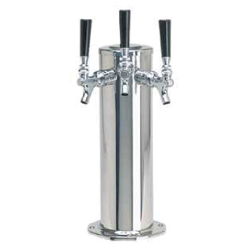 The Micro Matic DS-143-PSSKR Column Draft Beer Tower is a versatile countertop unit, with dimensions of 4 inches in diameter and 13-3/4 inches in height, designed to enhance beverage service in various commercial settings. This tower is glycol-cooled, utilizing the Kool-Rite™ integrated module, which ensures consistent temperature control and optimal beer quality. It features three stainless steel faucets, with a clearance of 10-3/8 inches for the side faucets and 11-1/8 inches for the center faucet, accommodating a range of glass sizes. The robust 6-inch diameter base provides stability and durability, suitable for high-traffic environments. The product lines and leak-proof shanks are constructed from stainless steel, ensuring long-lasting performance and hygiene. Additionally, the unit includes a cooling block and copper coolant lines, enhancing the efficiency of the cooling system. For easy installation, the tower comes with mounting gaskets and hardware. Its polished stainless-steel finish not only contributes to its sleek appearance but also facilitates easy cleaning and maintenance. The Micro Matic DS-143-PSSKR draft beer tower is an ideal choice for bars, restaurants, and catering services where reliability, efficiency, and quality are paramount in beer dispensing operations.