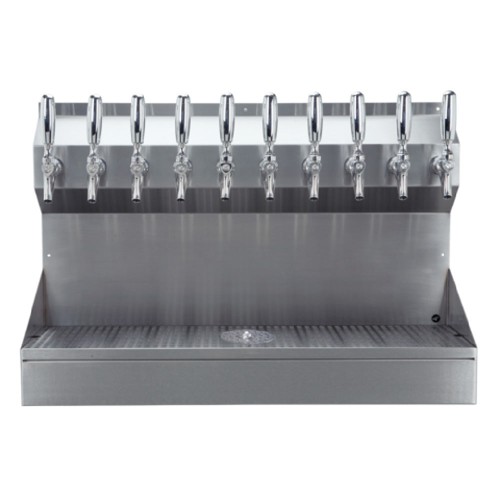 The Micro Matic KRONOS-10SSKRGR Kronos Draft Tower Wall Mount 30"W X 20-1/4"H is a meticulously designed draft beer dispensing solution tailored for commercial settings, where performance and aesthetic appeal converge. This wall-mounted draft tower is a standout with its polished stainless steel construction, ensuring durability and a modern look to complement any bar or restaurant ambiance. Featuring ten polished stainless steel faucets, each with a 3" on-center configuration and a generous 13" faucet clearance, this system is engineered for efficient and versatile operations. The glycol-cooled mechanism, powered by the Kool-Rite™ integrated module, highlights its capability to maintain optimal beer temperatures throughout service. An integrated drip tray, complete with a removable perforated insert and glass rinser, underscores the practicality of its design, offering ease of cleaning and convenience. The unit includes stainless steel product lines and copper coolant lines, further enhancing its reliability and efficiency. With a front skirt included and brushed stainless steel finish, the KRONOS-10SSKRGR not only meets the rigorous demands of commercial use but also adheres to NSF standards, ensuring safety and quality. This draft tower is an exemplary choice for venues seeking a high-performance, visually striking beer dispensing system.