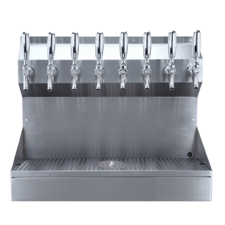 The Micro Matic KRONOS-8SSKRGR Kronos Draft Tower Wall Mount 24"W X 20-1/4"H is an innovative glycol-cooled draft dispensing solution designed for commercial use. This unit is equipped with an integrated Kool-Rite™ module, ensuring efficient cooling for optimal beverage temperature maintenance. It features eight polished stainless steel faucets, although handles are not included, offering robust dispensing capabilities. With a 3" OC (on center) configuration and a 13" faucet clearance, it provides ample space for various glass sizes. The tower boasts an integrated drip tray complete with a removable perforated insert and a glass rinser, enhancing cleanup efficiency and customer service. Constructed with durable materials, it includes stainless steel product lines and copper coolant lines for reliable performance. The front skirt is included, and the unit's brushed stainless steel finish lends a sleek, professional appearance suitable for upscale bars and restaurants. As an NSF-certified product, the KRONOS-8SSKRGR meets stringent public health standards, making it a trusted choice in the food and beverage industry. Its versatile and high-quality construction ensures it meets the needs of different market segments, from bars and restaurants to catered events and beverage-focused venues.
