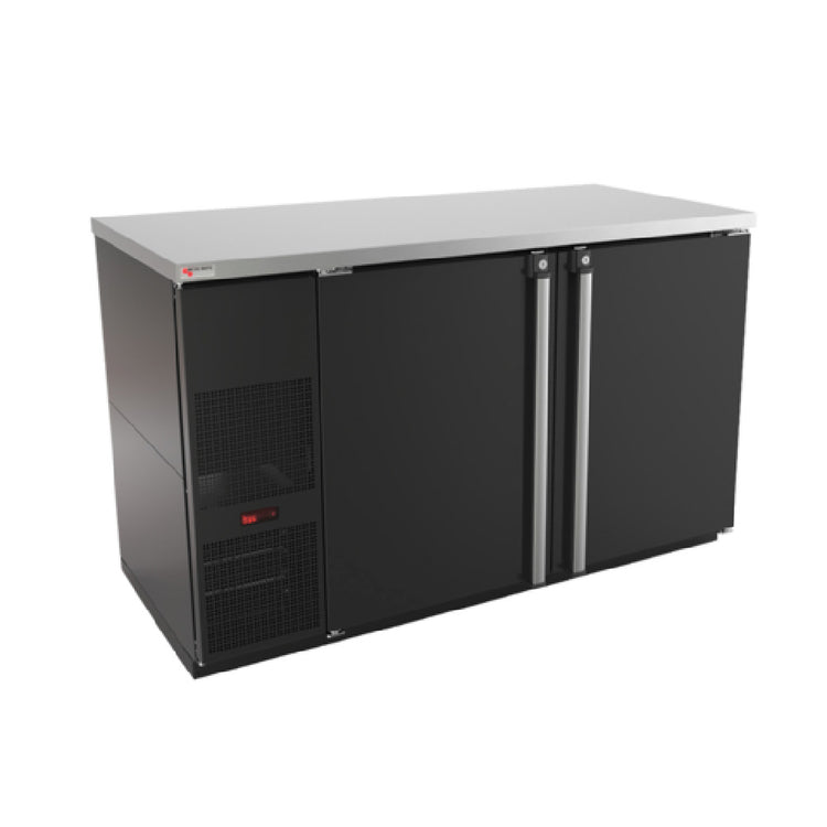 The Micro Matic MBB58-E Pro-Line E-Series Refrigerated Back Bar Cabinet Two-section is crafted for optimal performance and efficiency in commercial settings. With a width of 59-1/2 inches, this unit provides a substantial interior capacity of 23.7 cubic feet, accommodating a variety of beverages with ease. Designed with two solid hinged doors equipped with locks, it ensures secure storage while maintaining easy access. The cabinet includes two flat shelves and two divider shelves, allowing for organized placement of items. It features a user-friendly adjustable digital thermostat, ensuring precise temperature control. Interior lighting enhances visibility, while the front-ventilated design supports efficient cooling. An automatic condensate evaporator system ensures smooth operation with minimal maintenance. Constructed with stainless steel interior walls and floor, as well as a stainless steel top, the unit is robust and durable. The black vinyl over steel exterior adds a sleek, modern touch. Utilizing R290 Hydrocarbon refrigerant and powered by a 1/3 HP motor, the cabinet operates efficiently on a 115v/60/1-ph electrical system, drawing 3.0 amps via an 8-foot cord with NEMA 5-15P plug. Certified by cETLus and ETL-Sanitation, this back bar cabinet meets high standards of safety and sanitation, making it ideal for bars, restaurants, and hospitality venues.