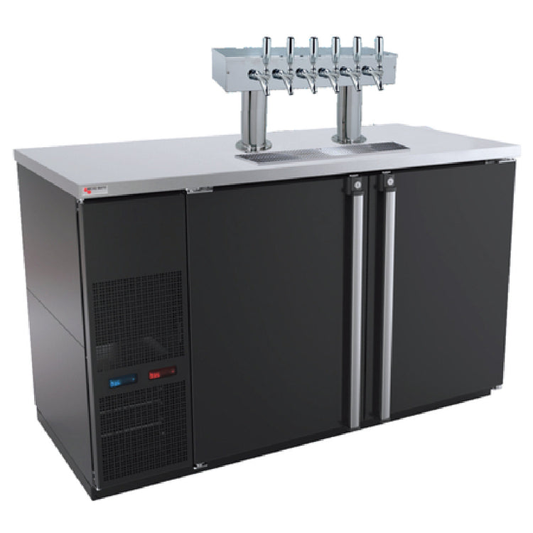 The Micro Matic MBB58BC-E-A Pro-Line™ E-Series Beverage Station is a sophisticated two-section, dual-temperature unit designed for precise beverage storage. With dimensions of 59-1/2 inches in width, it incorporates self-contained refrigeration and utilizes R290 Hydrocarbon refrigerant, ensuring an eco-friendly operation. This beverage station can accommodate six 1/6 slim barrel kegs on the cold side and two 1/6 slim barrel kegs on the warm side, making it a versatile solution for varied storage needs. Equipped with two built-in digital thermostats, it allows for precise temperature control. The unit features front ventilation and an automatic condensate evaporator, enhancing its efficiency. The 18-gauge stainless steel top adds to its durability, while the double pedestal tower with six faucets and a drip tray caters to high-demand service environments. The exterior is finished in black vinyl, and the interior is constructed from robust 20-gauge stainless steel. The MBB58BC-E-A operates with a 1/3 HP motor, powered by a 115v/60/1-ph electrical system, drawing 3.0 amps, and includes an 8-foot cord with a NEMA 5-15P plug. It is certified by cETLus and ETL-Sanitation, ensuring compliance with industry standards, making it ideal for bars, restaurants, and catering services.