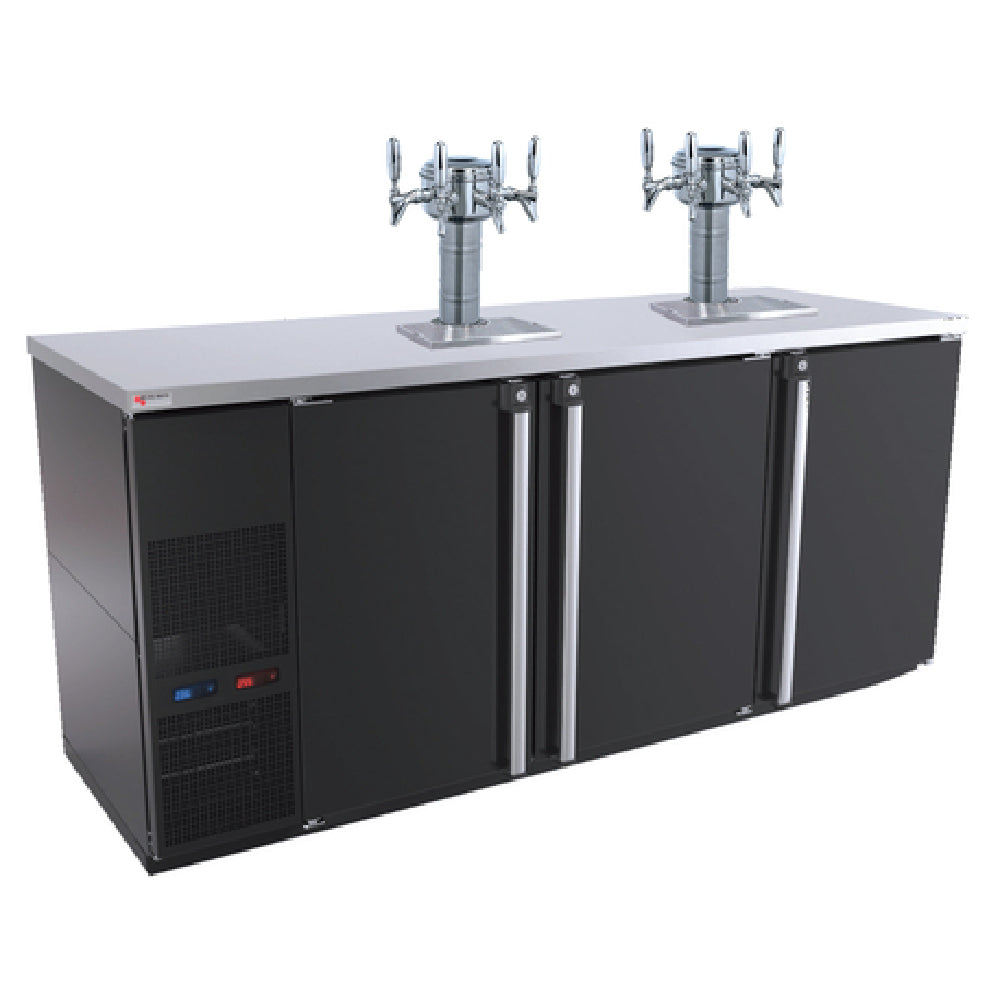 The Micro Matic MBB78BC-E-B Pro-Line™ E-Series Beverage Station is an advanced three-section, dual-temperature unit designed for optimal beverage service. It measures 80 inches in width and features self-contained refrigeration, enabling it to accommodate up to ten 1/6 slim barrel kegs on the cold side and two 1/6 slim barrels on the warm side. This dual functionality is managed by two built-in digital thermostats, providing precise temperature control for varying beverage needs. The unit is front ventilated, ensuring efficient air circulation, and includes an automatic condensate evaporator for hassle-free operation. Its exterior is covered in a sleek black vinyl, complemented by an 18-gauge stainless steel top, while the interior is constructed from 20-gauge stainless steel, promising durability and ease of cleaning. For dispensing, it is equipped with two mini mushroom towers, each featuring four faucets and a drip tray, facilitating a seamless beverage experience. The station also includes three solid hinged doors for secure storage. Efficiently powered by R290 Hydrocarbon refrigerant and a 1/3 HP motor, it operates on 115 volts, drawing 3.0 amps, and comes with an 8-foot cord and a NEMA 5-15P plug. This unit is cETLus and ETL-Sanitation certified, emphasizing its commitment to safety and hygiene standards.