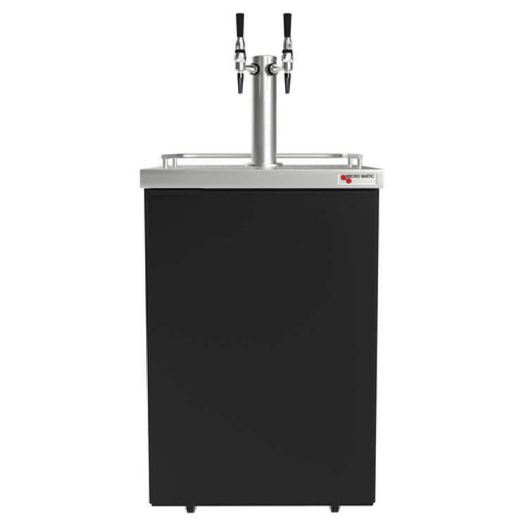The Micro Matic MDD23-E-AMER Americano Nitro Cold Brew Coffee Dispenser-Mobile-25"W is a versatile and highly efficient unit designed for serving both still and nitro cold brew coffee. With a compact width of 25 inches, this dispenser is suited for dynamic environments requiring mobility and flexibility. It boasts a self-contained refrigeration system and features a single draft tower with two faucets, supporting a capacity for two 1/6 size kegs. The integrated digital thermostat allows for precise temperature control, enhancing beverage quality. The unit includes a drip tray with a removable grill, complete with a hose and drain bottle for easy maintenance. A solid hinged door ensures secure access to the interior, which is equipped with a stainless steel floor for durability. The black vinyl over steel exterior provides a sleek and professional appearance, while casters facilitate mobility. The dispenser also includes an integrated nitrogen infusion module, requiring a separate nitrogen source, enriching the coffee experience with a creamy texture. Operating on R290 Hydrocarbon refrigerant, it is powered by a 1/10 HP motor, running on 115 volts, 60Hz, with a single-phase power supply drawing 1.5 amps. An 8-foot cord with a NEMA 5-15P plug is included. This unit is NSF, cETLus, and ETL-Sanitation certified, ensuring adherence to safety and sanitation standards.