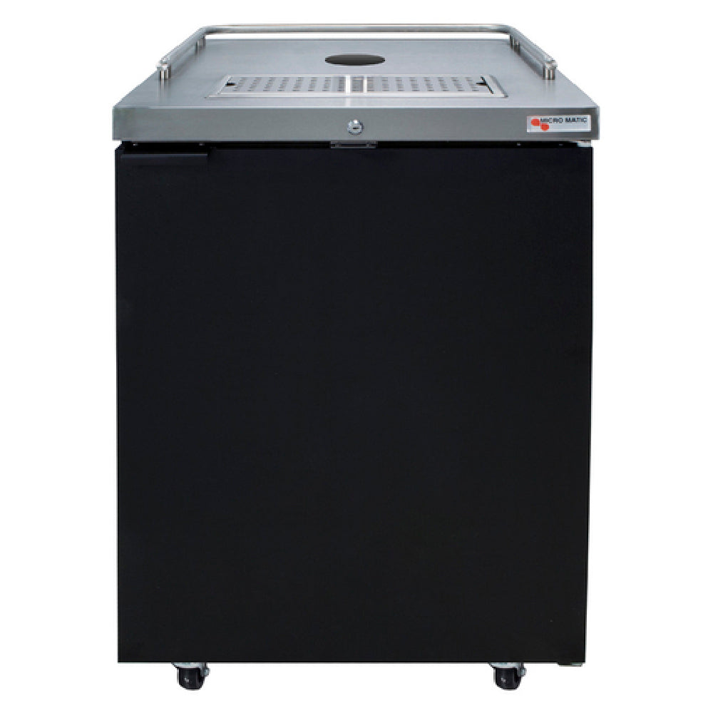 Micro Matic MDD23-E-LT Pro-Line™ E-Series™ Draft Beer Cooler Less Draft Tower is a versatile and robust refrigeration solution designed for the beverage industry, particularly for bars and restaurants requiring efficient draft beer storage. This one-section unit measures 25 inches in width and features self-contained refrigeration powered by a 1/6 HP compressor. It utilizes the environmentally friendly R134a refrigerant and operates at 115 volts with a 60 Hz frequency, drawing 2.5 amps, and is equipped with a NEMA 5-15P plug. With an 8.4 cubic feet capacity, the cooler efficiently holds and preserves beverages at optimal temperatures, which can be precisely controlled using the analog dial thermostat. The stainless steel drip tray, complete with a removable grill, hose, and drain bottle, ensures cleanliness and convenience. The cooler includes one solid hinged door with a lock for security and features an automatic condensate evaporator. The stainless steel interior floor with keg slides, combined with a sleek black vinyl over a steel exterior and stainless steel top with glass guard rails, enhances both durability and style. The unit is built on casters for mobility and is cETLus and ETL-Sanitation certified, ensuring compliance with rigorous safety and sanitation standards. Note that draft tower and tapping equipment are sold separately.