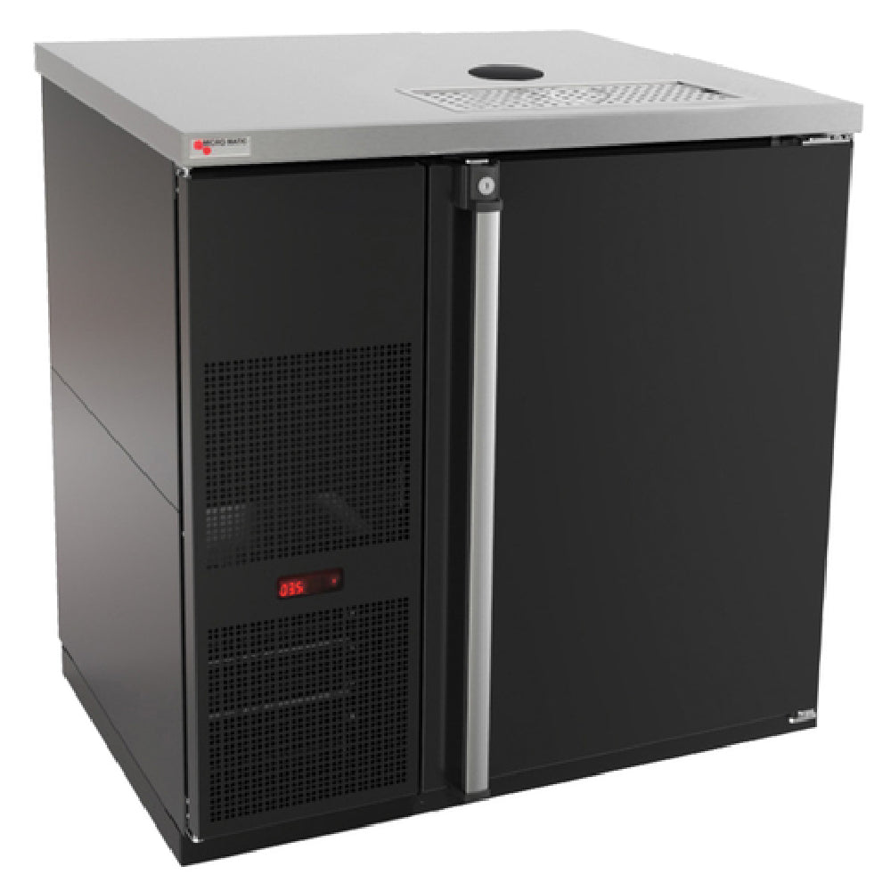 The Micro Matic MDD36-E-LT Pro-Line™ E-Series™ Draft Beer Cooler is a compact and efficient refrigeration unit designed specifically for the precise needs of the beverage industry. Measuring 36-3/4 inches in width, this one-section cooler is equipped with self-contained refrigeration and runs on R290 Hydrocarbon refrigerant, utilizing a 1/10 HP motor. Operating at 115 volts with 1.5 amps, it features a NEMA 5-15P plug and an 8-foot cord, making it suitable for a variety of professional settings. The cooler includes a digital thermostat for precise temperature control, ensuring optimal storage conditions. It also features an integral glass rinser, a stainless steel drip tray with an integrated glass rinser, and a removable grill, enhancing its functionality in high-traffic environments. With a solid hinged door that includes a lock, the cooler offers secure storage. Its construction features a stainless steel top and interior, with a black vinyl over steel exterior for durability and aesthetic appeal. The automatic condensate evaporator adds to its low-maintenance operation. This unit is cETLus and ETL-Sanitation certified, highlighting its compliance with safety standards. Note, the draft tower and tapping equipment are sold separately, allowing for customizable setup options for diverse market segment needs.