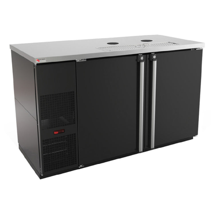 The Micro Matic MDD58-E-LT Pro-Line™ E-Series™ Draft Beer Cooler Less Draft Towers is a two-section, 59-1/2"W unit designed for efficient and precise beverage refrigeration. It features a self-contained refrigeration system powered by a 1/3 HP compressor, utilizing R290 Hydrocarbon refrigerant for environmentally friendly operation. The cooler boasts a spacious 23.7 cu. ft. capacity, enhanced by two solid hinged doors equipped with locks for secure storage. An integral glass rinser and a drip tray with a removable grill offer added convenience for beverage service. The stainless steel top and interior ensure durability and ease of cleaning, while the black vinyl over steel exterior provides a sleek appearance. A digital thermostat facilitates precise temperature control, and the automatic condensate evaporator enhances efficiency. This unit is powered by a 115v/60/1-ph electrical connection, drawing 3.0 amps, and equipped with an 8' cord for flexible installation, terminated with a NEMA 5-15P plug. This cooler is cETLus and ETL-Sanitation certified, emphasizing its quality and safety standards. This product is suitable for various market segments within the beverage industry, excluding draft towers and tapping equipment which are sold separately.