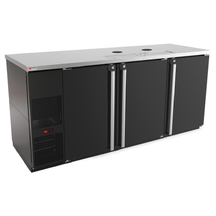 The Micro Matic MDD78-E-LT Pro-Line™ E-Series™ Draft Beer Cooler Less Draft Towers is an exceptional refrigeration solution designed to meet the diverse needs of the beverage and hospitality industry. With its substantial 30.8 cubic feet capacity, it accommodates a significant volume of beverages, making it ideal for bars, restaurants, and large events. This cooler features a robust structure with three solid hinged doors, each equipped with locks for secure storage. It utilizes a self-contained refrigeration system powered by a 1/3 HP compressor, ensuring efficient cooling with precision control provided by a digital thermostat. The unit's dimensions extend to 80 inches in width, offering ample configuration space. Constructed with a stainless steel top and interior, combined with a black vinyl over steel exterior, it promises durability and a sleek appearance. The cooler integrates a drip tray with an innovative glass rinser and removable grill, enhancing convenience and cleanliness. It operates on R290 Hydrocarbon refrigerant, aligning with eco-friendly standards, and is powered by a standard 115v/60/1-ph electrical connection, drawing only 3.0 amps. The 8-foot cord with a NEMA 5-15P plug ensures versatility in installation. Certified by cETLus and ETL-Sanitation, this cooler is a reliable and compliant choice for professional beverage service environments. (Note: Draft tower(s) and tapping equipment sold separately.)