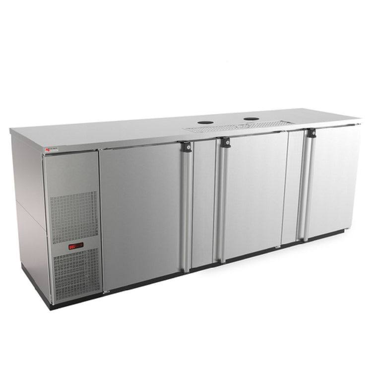 The Micro Matic MDD94S-E-LT Pro-Line™ E-Series™ Draft Beer Cooler Less Draft Towers is an advanced refrigeration unit designed for high-demand settings, with a spacious 39.2 cubic feet capacity spread across three sections. It features a self-contained refrigeration system powered by a 1/3 HP motor, operating at 115v/60/1-ph and drawing 3.0 amps, suitable for a variety of commercial environments. Measuring 95-1/2 inches in width, the cooler is equipped with three solid hinged doors, each fitted with a lock to ensure security. Its stainless steel top, interior, and exterior provide durability and ease of maintenance. A drip tray with an integrated glass rinser and removable grill enhances functionality and cleanliness. The built-in blower and front-ventilated design ensure efficient cooling performance, while the automatic condensate evaporator simplifies maintenance. Utilizing eco-friendly R290 Hydrocarbon refrigerant, this cooler aligns with modern sustainability standards. With an 8-foot power cord and NEMA 5-15P plug, it is cETLus and ETL-Sanitation certified, making it a reliable choice for bars, restaurants, and other venues requiring efficient draft beer storage. Note that tapping equipment is sold separately, allowing for customizable configurations tailored to specific operational needs.