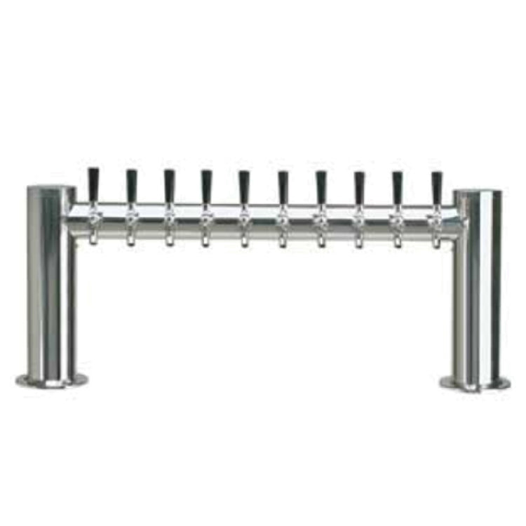 The Micro Matic METRO-H-10PSSKR Metropolis "H" Draft Beer Tower is a state-of-the-art dispensing solution designed for efficiency and style in beverage service industries. Measuring 38 inches in width and 16 inches in height, this countertop draft beer tower offers a sleek and durable polished stainless steel finish. It features ten 304 stainless steel faucets, strategically spaced 3 inches on center, providing ample 12-inch faucet clearance for seamless pouring operations. The tower's two 4-inch diameter columns, each supported by a 6-inch diameter base, ensure stability and elegance. The integrated Kool-Rite glycol cooling module guarantees consistent temperature control, aided by a cooling block and copper coolant lines. High-quality 304 stainless steel product lines and leak-proof shanks further underscore its reliable construction. This product includes mounting gaskets and hardware for straightforward installation. Its NSF certification highlights compliance with industry health standards, making it a trusted choice for bars, restaurants, and commercial venues seeking a high-performance draft beer delivery system. Whether catering to a bustling bar or a sophisticated restaurant setting, the Micro Matic METRO-H-10PSSKR delivers exceptional value through its robust design and precision-engineered features.