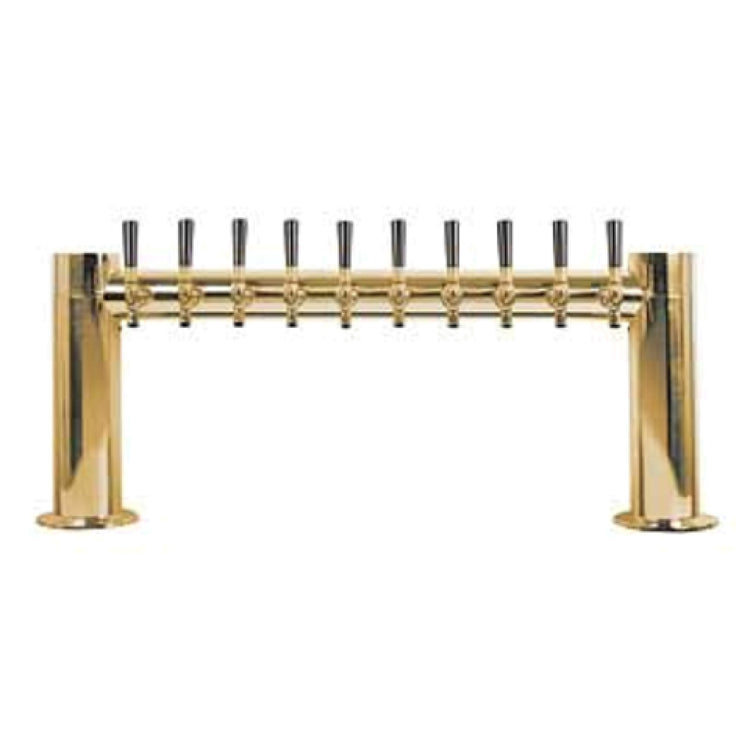 The Micro Matic METRO-H-10PVDKR Metropolis "H" Draft Beer Tower is a precision-engineered countertop unit designed for seamless integration in beverage service environments. With a width of 38 inches and a height of 16 inches, this tower is glycol-cooled, utilizing the Kool-Rite integrated module to maintain optimal temperatures. It boasts 10 PVD brass-plated stainless steel faucets, noted for their durability, with a 3-inch on-center spacing and a 12-inch faucet clearance for efficient service. The dual 4-inch diameter columns, each with a 6-inch base, provide robust support and stability. The tower is built with 304 stainless steel product lines and leak-proof shanks, ensuring long-lasting performance and reliability. The inclusion of a cooling block and copper coolant lines enhances its cooling efficiency. Mounting gaskets and hardware are provided for easy installation, and the unit features a PVD brass finish, adding a touch of elegance to its robust construction. Certified by NSF, this draft beer tower is ideal for establishments seeking a high-performance, reliable solution for serving draft beverages, catering to various market segments within the beverage industry by combining advanced technology with aesthetic appeal.