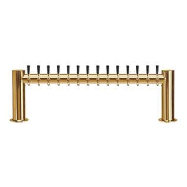 The Micro Matic METRO-H-14PVDKR Metropolis "H" Draft Beer Tower is a high-performance solution for bars and restaurants seeking a reliable and stylish draft system. This countertop unit measures 50"W x 16"H, making it an ideal fit for various service areas. It features a glycol-cooled system with the Kool-Rite™ integrated module, ensuring optimal temperature control for superior draft quality. Equipped with fourteen PVD brass-plated stainless steel faucets, the tower’s durable construction is highlighted by its 304 stainless steel product lines and leak-proof shanks, ensuring longevity and minimal maintenance. The 12" faucet clearance accommodates various glass sizes, while the 3" OC spacing supports efficient service. The tower is supported by two 4" diameter columns with 6" diameter bases, ensuring stability and ease of installation through provided mounting gaskets and hardware. The PVD brass finish adds an elegant touch, making it a visually appealing addition to any setting. Copper coolant lines and a cooling block enhance the system's performance, delivering consistent cooling throughout operations. NSF certification guarantees compliance with public health standards, making the Micro Matic METRO-H-14PVDKR Metropolis "H" Draft Beer Tower a premium choice for establishments aiming to elevate their beverage service capabilities.
