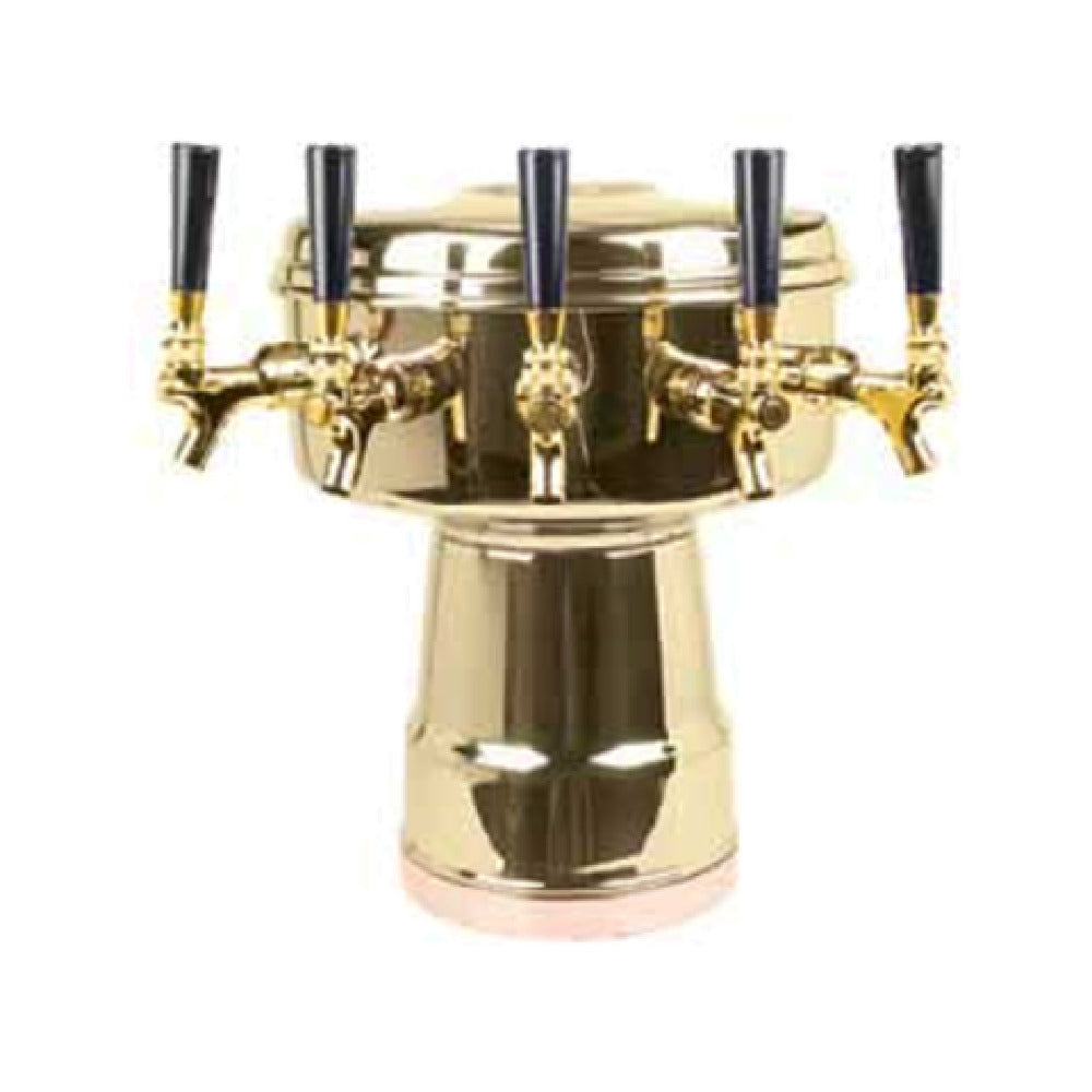 The Micro Matic MTB-5BR Mushroom Draft Beer Tower is a meticulously designed countertop unit with a diameter of 12 inches and a height of 15-5/16 inches. Tailored for those seeking premium draft beer dispensing solutions, this tower features an air-cooled system to maintain optimal beverage temperature. Equipped with five brass faucets, it ensures a robust and versatile pouring capability for multiple beer selections, although handles are not included. The faucets are positioned with a 3-5/8 inch on-center configuration, providing an ergonomic and efficient flow. With a faucet clearance of 10 inches, it accommodates a variety of glass sizes, enhancing its adaptability. The base measures 7-1/2 inches in diameter, offering a stable and secure placement on any countertop. Its polished brass finish not only adds a touch of elegance but also ensures durability and long-lasting performance. This draft beer tower is an ideal choice for bars, restaurants, and event venues looking to elevate their beverage service with a blend of style and functionality. Its detailed specifications and premium construction make it a standout fixture in any commercial setting, promising an exceptional draft beer experience to patrons.