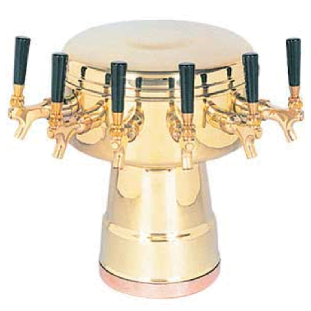 The Micro Matic MTB-6BR Mushroom Draft Beer Tower is a premium countertop unit designed for precision and elegance in beverage dispensing. With dimensions of 12" diameter by 15-5/16" height, it offers a compact yet significant presence in any bar or restaurant setup. The tower features six brass faucets, not including handles, arranged with 3-5/8" on-center spacing, providing ample access with a 10" faucet clearance for efficient pour operations. Its air-cooled system ensures the beer remains at an optimal temperature from keg to glass. The tower's polished brass finish not only enhances its aesthetic appeal but also complements a variety of interior decors. The base measures 7-1/2" in diameter, ensuring stability on the countertop. The Micro Matic MTB-6BR is suitable for venues seeking to enhance their beverage service with a reliable and stylish draft system. It is ideal for upscale bars and restaurants aiming to offer an exquisite serving experience. This product's robust construction and polished design cater to the needs of different market segments within the hospitality industry, ensuring consistent performance and visual appeal. Its technical specifications make it a standout choice for establishments focused on quality and efficiency in draft beer dispensing.