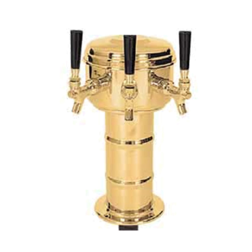 The Micro Matic MTM-3BRKR Mini-Mushroom Draft Beer Tower is a premium countertop beer dispensing solution, measuring 7-5/16" in diameter and standing 14" tall. This tower is distinguished by its glycol-cooled system, featuring the Kool-Rite™ integrated module, which ensures optimal temperature regulation for draft beer. It comes equipped with three stainless steel faucets, spaced 5" on center, though handles are not included. Each faucet provides a generous 10-1/4" clearance, accommodating various glass sizes with ease. The base of the tower measures 6" in diameter, providing a stable and secure mount on any countertop surface. The product lines and shanks are made of durable stainless steel, while the coolant lines are constructed from copper, ensuring longevity and consistent performance. The tower is finished in polished brass, offering an elegant aesthetic suitable for upscale settings. The NSF certification underscores its adherence to strict public health and safety standards. The MTM-3BRKR is an ideal choice for bars, restaurants, and breweries looking to enhance their draft beer service with a reliable and visually appealing solution that seamlessly integrates into a variety of decor styles.