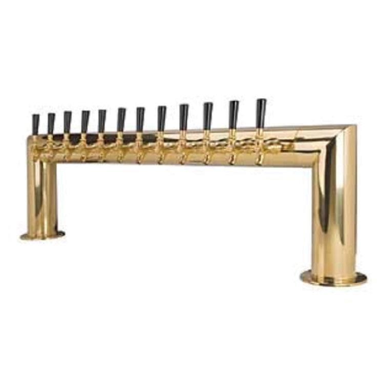 The Micro Matic PT4A-12PVDKR Pass-Thru Draft Beer Tower Countertop 47"W X 14-1/4"H is an engineering marvel designed for both aesthetic appeal and functionality in high-demand environments. This glycol-cooled system, featuring the Kool-Rite™ integrated module, ensures efficient temperature control, making it a perfect fit for bars and restaurants aiming to serve perfectly chilled draft beer. With its 12 PVD brass-plated stainless steel faucets, spaced at 3" on center, this draft beer tower provides ample service capacity, accommodating a wide range of craft beers or standard offerings. The 10-1/2" faucet clearance allows for easy filling of glasses and pitchers. Its dual 4" diameter columns, each with a 6" diameter base, ensure stability and durability in high-traffic settings. The stainless steel product lines and leak-proof shanks are designed to minimize maintenance and maximize reliability. Complemented by a cooling block and copper coolant lines, these features work in tandem to maintain the beer at optimal serving temperatures. The PVD brass finish adds a touch of elegance, making it a standout centerpiece on any countertop. With mounting gaskets and hardware included, installation is straightforward, solidifying its status as a top choice for establishments prioritizing both performance and visual appeal.