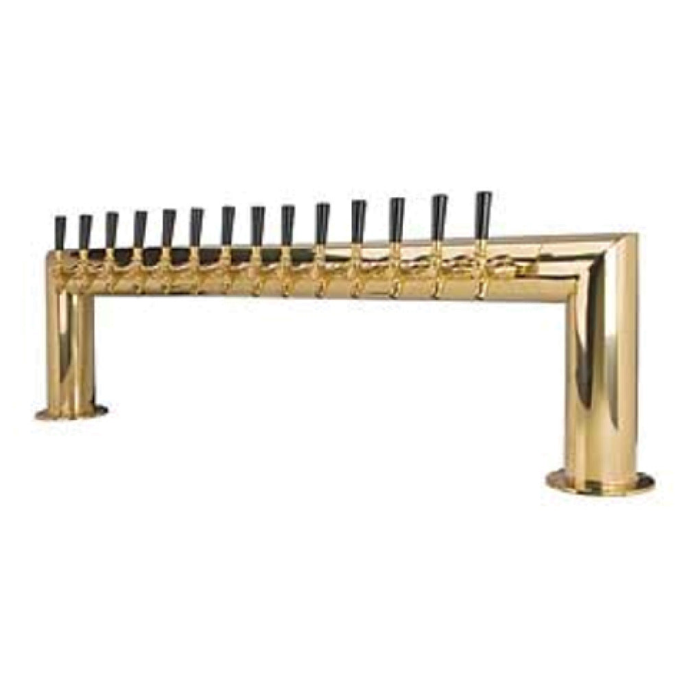 The Micro Matic PT4A-14PVDKR Pass-Thru Draft Beer Tower Countertop 53"W x 14-1/4"H is a sophisticated glycol-cooled system, specifically crafted for optimal beverage dispensing in both commercial and upscale home settings. This unit is equipped with the Kool-Rite™ integrated module, ensuring precise temperature regulation for superior draft beer quality. With a spacious width of 53 inches and a height of 14-1/4 inches, this tower is designed for efficiency and style. It features fourteen PVD brass-plated stainless steel faucets, spaced 3 inches on-center, providing ample dispensing capacity. The faucet clearance of 10-1/2 inches facilitates easy beer pouring while maintaining cleanliness. Supporting this are two robust 4-inch diameter columns with 6-inch diameter bases, offering stability and an elegant look. The unit is completed with stainless steel product lines and leak-proof shanks, enhancing durability and minimizing maintenance needs. Additionally, it includes a cooling block and copper coolant lines for enhanced thermal performance. Mounting gaskets and hardware come included for seamless installation. The PVD brass finish not only offers a classic look but ensures longevity and resistance to wear, making the Micro Matic PT4A-14PVDKR a reliable choice for diverse market segments seeking quality and precision in draft beer dispensing.