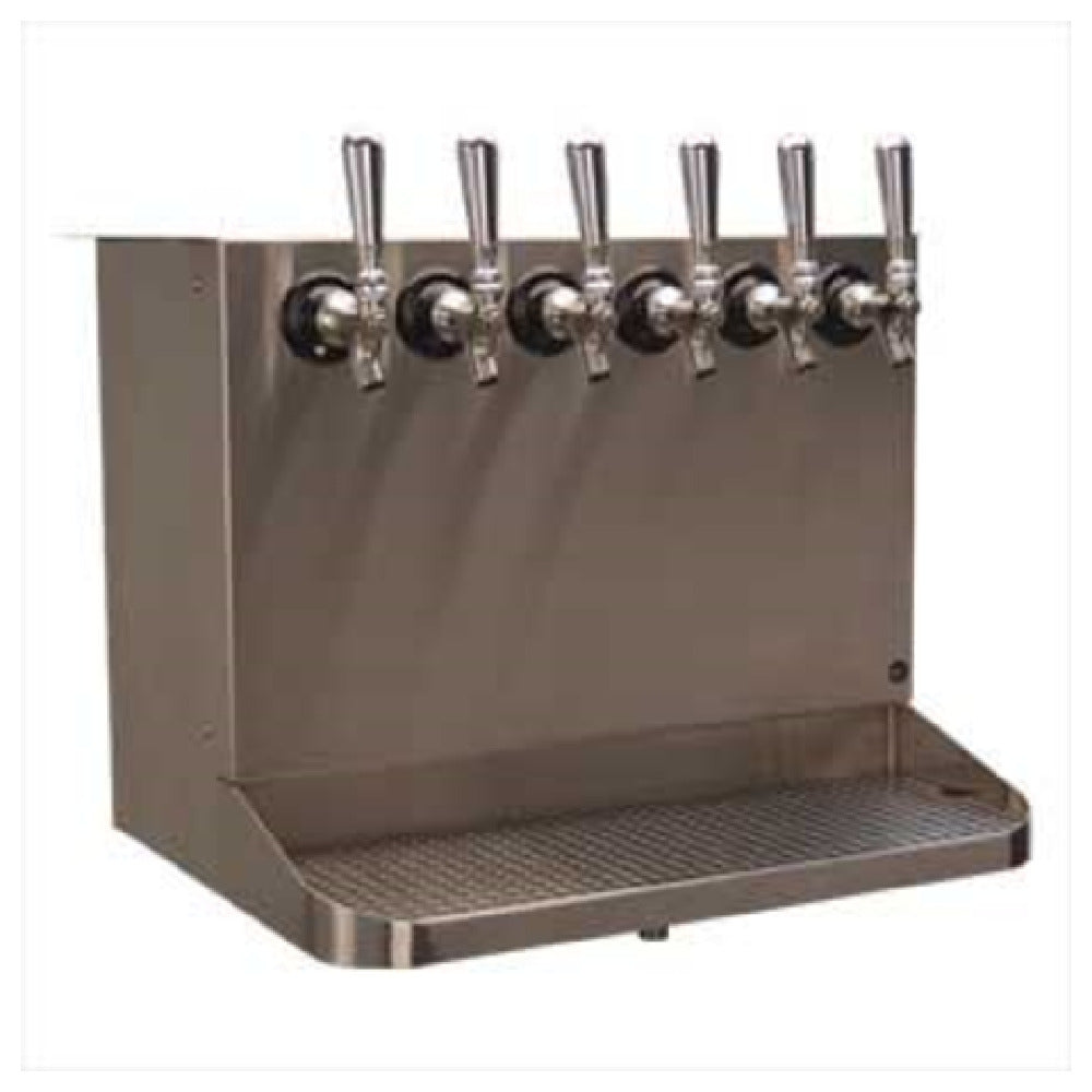 The Micro Matic SB620-KR Draft Beer Dispenser Underbar With Drip Tray 22"W X 16"H is a highly specialized piece of equipment designed for efficiently serving draft beer in commercial settings. It features a compact form factor with dimensions of 22 inches in width and 16 inches in height, making it suitable for underbar placement and optimizing space in busy bars or restaurants. This dispenser is equipped with Kool-Rite™ glycol cooling technology, ensuring consistent and optimal beer temperature throughout service. It includes six stainless steel faucets arranged on 3-inch centers, catering to venues with diverse beer offerings. The unit is designed with five holes for easy installation and adjustments. A removable front panel facilitates straightforward maintenance and cleaning, essential for high-volume service areas. The integrated drip tray is designed to maintain cleanliness and prevent spillage, enhancing efficiency and hygiene. Finished in brushed stainless steel, the dispenser not only provides durability but also a sleek, professional appearance suitable for any establishment. The product is NSF certified, confirming its adherence to strict public health and safety standards. The Micro Matic SB620-KR is a versatile and reliable choice for any establishment aiming to offer quality draft beer service with ease and precision.