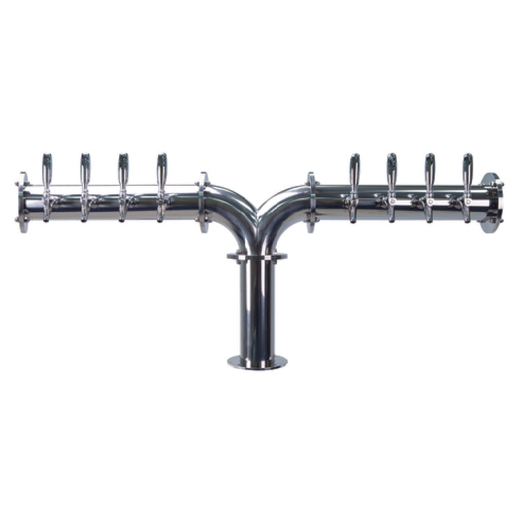 The Micro Matic TT-Y-8KR-11 Titan "Y" Draft Beer Tower - countertop 52-3/4"W x 19-7/8"H, is a top-tier selection for establishments requiring efficient and high-quality draft beer dispensing solutions. This tower is glycol-cooled, featuring a Kool-Rite™ integrated module to maintain optimal beverage temperatures. Its design includes eight 304 stainless steel faucets, providing a durable and hygienic dispensing option, though handles are not included. These faucets have a 4" OC (on-center) spacing and offer a generous 14" faucet clearance, accommodating a variety of glass sizes. The tower itself is supported by a robust 4" diameter brew pipe with a solid 7" diameter base, ensuring stability during operation. Additionally, the product lines are made of 304 stainless steel, complemented by leak-proof shanks to prevent spillage. The inclusion of a cooling block and copper coolant lines enhances the temperature regulation, ensuring each pour is served at the desired temperature. The polished stainless steel finish not only provides a sleek aesthetic but also ensures easy cleaning and maintenance. Certified by NSF, this draft beer tower is an excellent fit for bars, restaurants, and breweries seeking reliable and efficient beverage dispensing equipment.