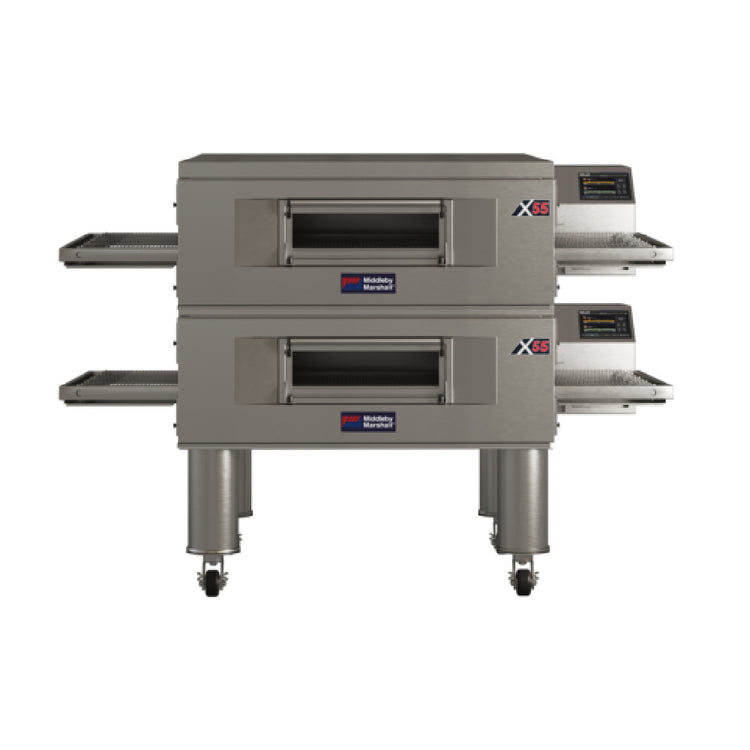 Middleby Marshall X55-2 Conveyor Oven - gas fired, double deck - is a premium cooking appliance designed for high-volume commercial kitchens. Featuring a 55-inch long cooking chamber and a 32-inch width by 91-inch length belt, this oven efficiently handles large-scale baking needs. The bake/time conveyor speed and reversible conveyor direction offer flexibility and precision in cooking. Its front loading window provides convenient access, while the durable stainless steel construction on the front, sides, top, and interior ensures longevity and ease of maintenance. Equipped with legs and casters, the unit offers mobility and stability in a busy kitchen environment. With a powerful 280,000 BTU output, the X55-2 delivers consistent heat for various baking tasks, making it suitable for pizzerias, bakeries, and fast-food restaurants. Certified by cETLus and ETL-Sanitation, this conveyor oven meets rigorous safety and sanitation standards, ensuring compliance and reliability for food service operations. The Middleby Marshall X55-2 is an exceptional choice for professional kitchens looking for a versatile and robust oven solution, capable of meeting the demands of different market segments within the food industry.