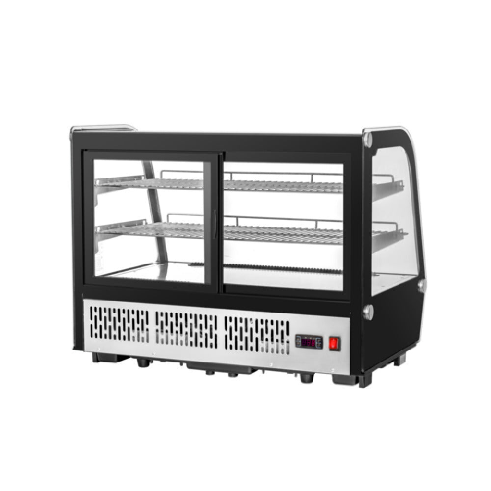 Migali Industries, C-56CTC-35, Competitor Series® Refrigerated Display Case Countertop, 34.6"W, 5.7 cu. ft., auto-defrost system, double-paned tempered curved display glass, (2) chrome epoxy-plated shelves, front, sides & top glass, forced-air refrigeration system, LED interior lighting, sliding glass doors, digital temperature controller & temperature read-out, bottom mount compressor, ergonomic construction, stainless steel interior & exterior front, glass covered black sides, pre-installed feet, R290 Hydrocarbon refrigerant, 1/3 HP, 3 amps, NEMA 5-15P, cETLus, ETL-Sanitation, Migali® Protection Plan: 2 Year Parts & Labor Warranty, 5 Year Compressor Warranty