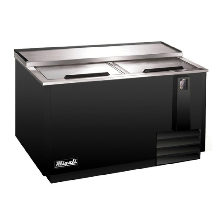 The Migali Industries C-HBC65-HC Competitor Series® Bottle Cooler is a highly efficient cooling unit, measuring 65 inches in width with an 18 cubic feet capacity. This cooler is engineered with two sliding lids equipped with locks, ensuring secure storage. It can hold up to 24 cases of 12 oz bottles or 32 cases of 12 oz cans, making it a versatile choice for various commercial settings. The cooler features side mount self-contained refrigeration, powered by a 1/3 HP compressor using R290 Hydrocarbon refrigerant, offering eco-friendly operation. The interior is divided into three sections with epoxy-coated wire bin dividers for organized storage. A digital controller/display provides precise temperature management between +33°F to +41°F, supported by forced air cooling. The design includes a bottle opener/cap catcher for added convenience, alongside a sleek black steel exterior and a durable stainless steel top and interior. The unit's stability is maintained with four leveling feet. Operating at 115v/60/1-ph and 8.0 amps with a NEMA 5-15P plug, the product meets cETLus and ETL-Sanitation standards. Additionally, Migali® pledges to plant a tree for every product sold in partnership with the Earth Day Network, emphasizing sustainability.