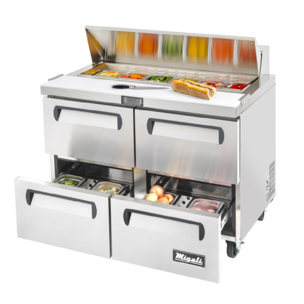 The Migali Industries C-PP67-D-HC Migali® Pizza Prep Table is a versatile and efficient solution specifically designed for the food service industry, particularly those in need of robust and reliable refrigeration options. This pizza prep table measures 67 inches in width and boasts a 12 cubic feet capacity, offering ample space for various ingredients. It comes equipped with four shelves, providing organized storage. The unit features a digital controller with a temperature read-out, allowing precise temperature management within a range of +33°F to +41°F. The polished stainless steel exterior and interior, along with rounded drawer edges and recessed drawer handles, add both durability and aesthetic appeal. The forced air refrigeration system ensures consistent cooling, utilizing R290 Hydrocarbon refrigerant for eco-friendly operation. Pre-installed casters and shelving enhance mobility and convenience. Operating at 115 volts with a single-phase power requirement, it draws 2.3 amps and is compatible with NEMA 5-15P outlets. The C-PP67-D-HC is cETLus and ETL-Sanitation listed, confirming its adherence to high standards of safety and sanitation. This makes it an ideal choice for pizza parlors, restaurants, and other commercial kitchens seeking reliable performance and efficiency.