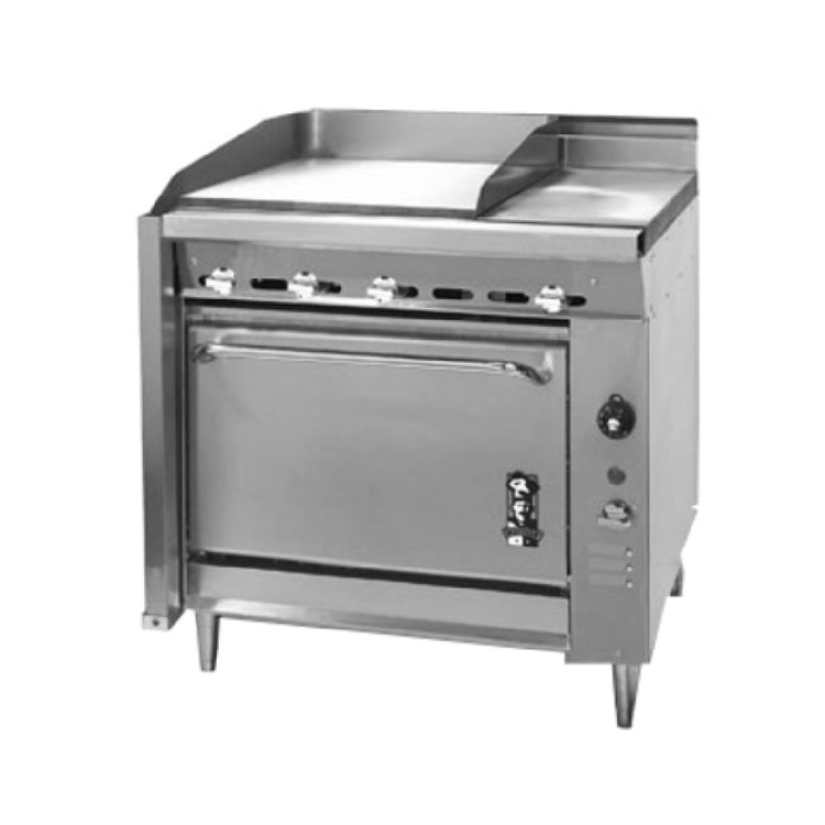 The Montague Company 136-0E Legend™ Heavy Duty Range - gas - 36" is a robust kitchen appliance designed for demanding commercial environments. It features a 24" griddle located on the left side, constructed with a 3/4" thick surface for efficient heat retention and distribution, providing optimal cooking performance. On the right side, it includes a 12" even heat hot top, ensuring consistent cooking temperatures across its surface. The unit boasts a standard oven base, offering versatility for various cooking applications. The stainless steel front and a 4" flue riser contribute to its durability and ease of maintenance, while the black sides provide a sleek aesthetic. The heavy duty range is supported by 6" high adjustable stainless steel legs, ensuring stability and adaptability to different kitchen setups. With a powerful output of 105,000 BTU, this range is designed to handle high-volume cooking with ease. It is certified by NSF, cETLus, and CE, affirming its adherence to stringent safety and quality standards. The Montague Company 136-0E Legend™ Heavy Duty Range is an ideal choice for restaurants, catering services, and other professional culinary settings where efficiency and reliability are paramount.