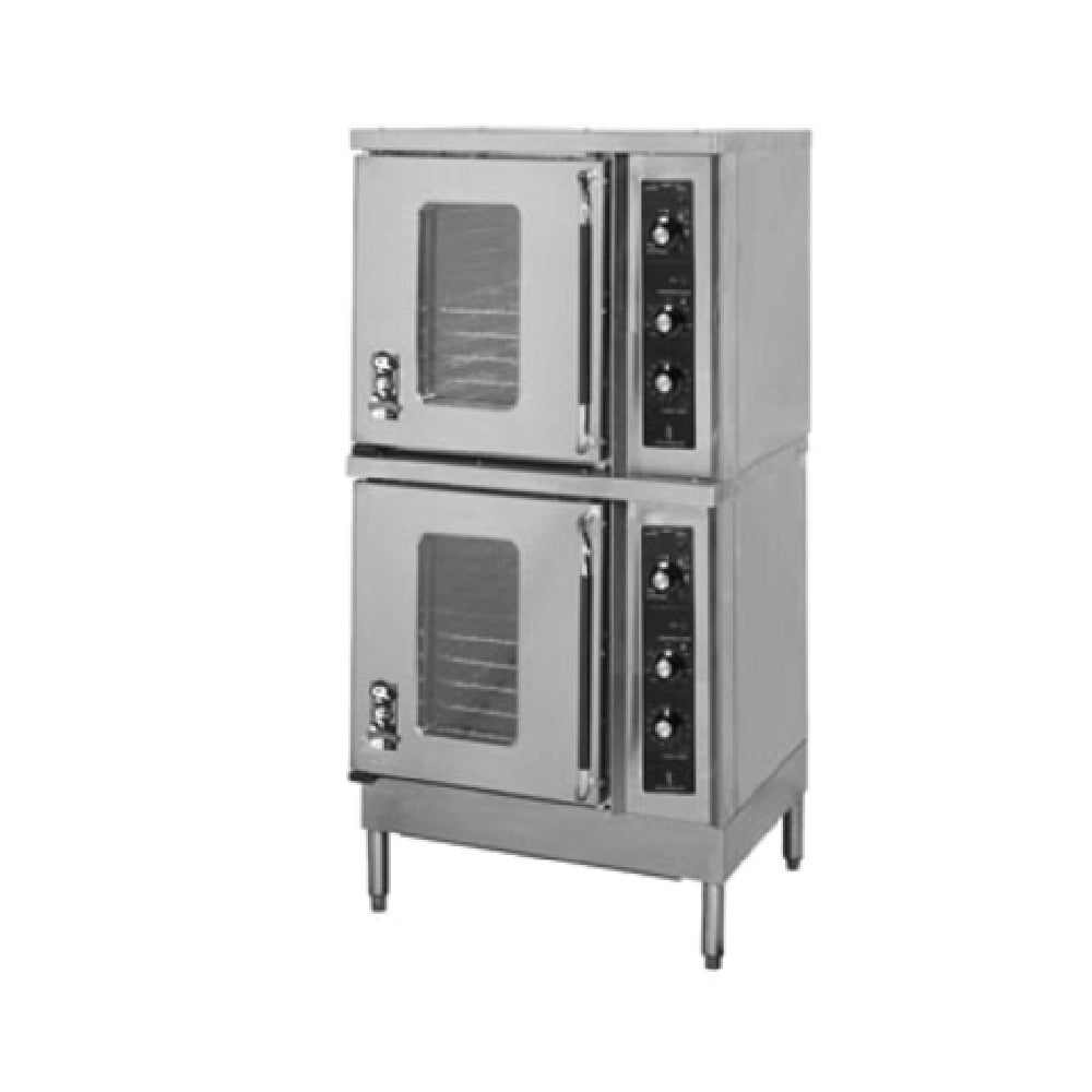 The Montague Company 2EK8(O) Vectaire Convection Oven Electric Half-size Double-deck is a powerhouse of efficiency and design, tailored for versatile culinary environments. Featuring dual electric convection ovens, each with a 7.5 kW output, this unit is engineered to deliver consistent cooking results in high-demand settings. Its half-size, double-deck construction maximizes kitchen space while providing ample cooking capacity, making it suitable for various segments of the food industry, from bustling bakeries to high-volume restaurant kitchens. The oven boasts thermostatic controls, complemented by a 60-minute timer, allowing precise temperature management and cooking duration for a variety of dishes. Its two-speed motor adapts to different cooking needs, enhancing versatility in meal preparation. A vertical opening door with a right hinge and window adds convenience and visibility, streamlining the cooking process. The oven's exterior is crafted with a stainless steel front, sides, and top, ensuring durability and ease of cleaning. Supported by 6-inch adjustable legs, it can be tailored to user preferences and kitchen requirements. Certified by NSF and cULus, this convection oven meets rigorous safety and sanitation standards, making it a reliable choice for professional chefs and culinary institutions seeking robust performance and quality.