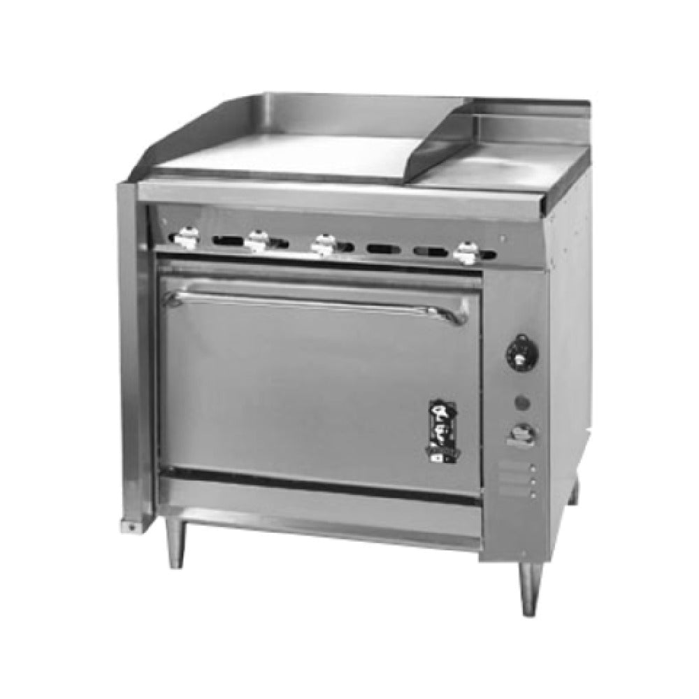 The Montague Company 36-0E Legend™ Heavy Duty Range is a robust and versatile gas appliance designed for professional culinary environments. This 36-inch heavy-duty range features a 24-inch griddle on the left, boasting a substantial 3/4-inch thickness for optimal heat retention and even cooking results. On the right, a 12-inch even heat hot top provides consistent temperature control, catering to diverse cooking techniques. The open cabinet base with a stainless steel front and a 4-inch flue riser adds functionality and durability to the design. With black sides and black intermediate and bottom shelves, this range is aesthetically pleasing and practical. Equipped with 6-inch high adjustable stainless steel legs, it ensures stability and adaptability to various kitchen layouts. With an impressive energy output of 65,000 BTU, this range is well-suited for high-volume cooking demands. Compliant with NSF, cETLus, and CE certifications, the Montague Company 36-0E Legend™ Heavy Duty Range meets stringent safety and performance standards. Its blend of technical excellence and reliable construction makes it an ideal choice for restaurants, catering services, and other commercial kitchens seeking a dependable cooking solution.