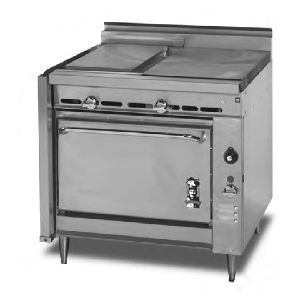 The Montague Company 36-12EPL Legend™ Heavy Duty Range is a versatile and durable kitchen appliance designed for professional culinary environments. This gas-powered range measures 36 inches in width and is equipped with a dual cooking surface configuration: an 18-inch plancha top on the left side and an 18-inch even heat hot top on the right. The plancha top is 3/4 inch thick, allowing for precise manual control and efficient heat distribution. Featuring an open cabinet base, the range is constructed with a stainless steel front and a 4-inch flue riser, complemented by black sides and black intermediate and bottom shelves. The 6-inch high adjustable stainless steel legs offer stability and flexibility in kitchen setups. With a powerful output of 55,000 BTUs, this range delivers exceptional performance for high-demand cooking tasks. Suitable for a variety of market segments within the food service industry, this heavy-duty range is NSF certified, cETLus listed, and CE marked, ensuring compliance with rigorous safety and sanitation standards. The Montague Company 36-12EPL Legend™ Heavy Duty Range is an optimal choice for professional kitchens seeking a reliable and efficient cooking solution.
