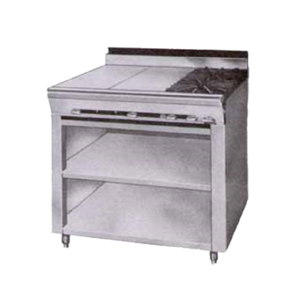 The Montague Company 36-3E Legend™ Heavy Duty Range - gas, 36" is a versatile piece of kitchen equipment engineered for demanding culinary environments. This range is equipped with dual 12" even heat hot tops on the left side and two 12" 30,000 BTU open burners on the right, offering a total of 100,000 BTU of cooking power, making it well-suited for both fine dining restaurants and high-volume commercial kitchens. The open cabinet base with a stainless steel front and a 4" flue riser ensures durability and efficient ventilation, while the black sides and black intermediate and bottom shelves add a sleek, modern look. Adjustable stainless steel legs, standing 6" high, provide stability and customizable height to fit various kitchen configurations. Certified by NSF, cETLus, and CE, this range adheres to rigorous safety and efficiency standards, meeting the requirements of diverse market segments within the foodservice industry. The Montague Company 36-3E Legend™ Heavy Duty Range combines robust performance with practical design, making it a valuable addition to any professional kitchen setting. Its technical specifications and certifications underscore its commitment to quality and reliability, catering to the needs of chefs and kitchen operators across different culinary sectors.