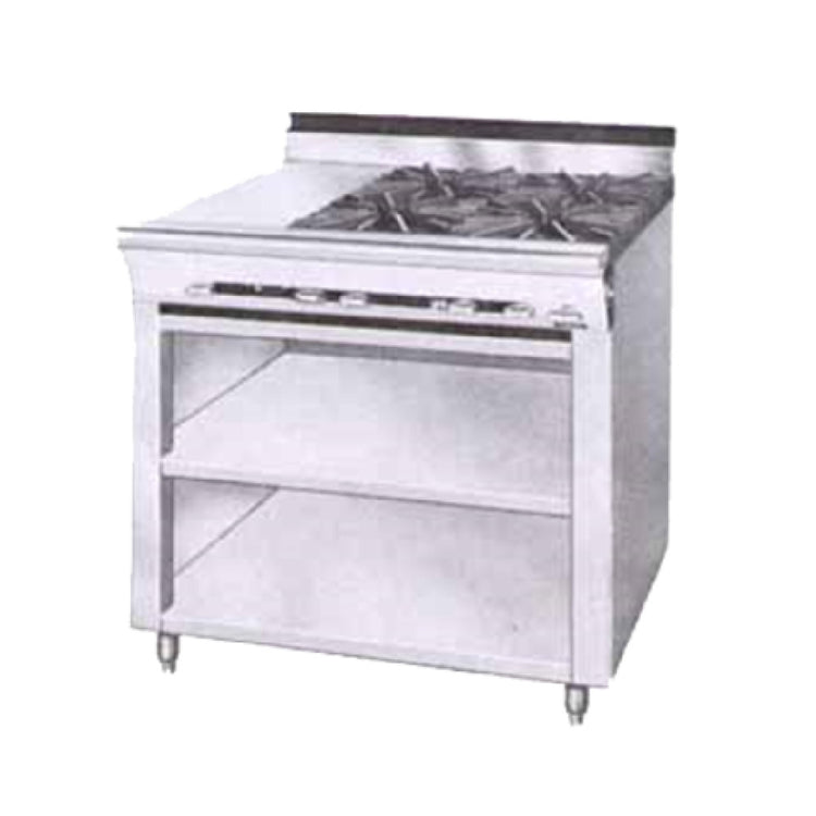 The Montague Company 36-4E Legend™ Heavy Duty Range - gas - 36" is a premium kitchen appliance, designed for commercial culinary environments. This robust range features a 12" even heat hot top located on the left side, complemented by four 12" open burners on the right, each boasting 30,000 BTU, providing a total of 140,000 BTU of cooking power. The range’s open cabinet base is accentuated by a stainless steel front and a 4" flue riser, ensuring efficient ventilation. Black sides and black intermediate and bottom shelves contribute to its sleek design, while the 6" high adjustable stainless steel legs offer customizable height to meet diverse kitchen needs. Certified by NSF, cETLus, and CE, this range adheres to stringent safety and quality standards, making it suitable for professional chefs and restaurateurs seeking reliable and powerful cooking equipment. The Montague 36-4E Legend™ is engineered to deliver exceptional performance and versatility, making it an invaluable addition across various segments of the food service industry, from high-volume restaurants to specialized culinary operations. Its durable construction and efficient design make it a standout choice for those prioritizing precision and power in their cooking operations.