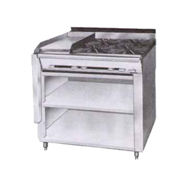 The Montague Company 36-6 Legend™ Heavy Duty Range is a versatile and robust kitchen appliance designed to meet the high demands of culinary professionals. This 36-inch gas range incorporates a 12-inch griddle on the left, distinguished by its 3/4-inch thickness and manual control, ensuring precise cooking outcomes. The right side features four open burners, each delivering an impressive 30,000 BTU, contributing to a combined output of 135,000 BTU. The open cabinet base, crafted with a stainless steel front and a 4-inch flue riser, enhances both durability and functionality. The range's black sides and intermediate and bottom shelves add a sleek aesthetic while ensuring ample storage. It stands on 6-inch high adjustable stainless steel legs, facilitating stability and ease of cleaning. Compliant with NSF standards and certified by cETLus and CE, this range is designed for safety and efficiency. This product is ideally suited for high-output kitchens, providing the necessary power and reliability for various culinary tasks, making it a valuable tool for both small restaurants and large-scale food service operations.