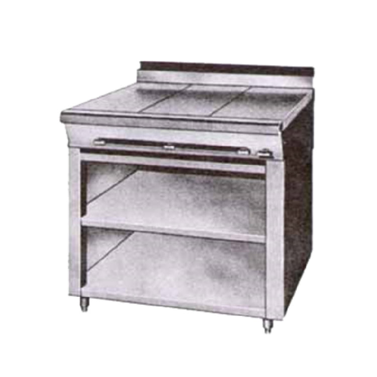 The Montague Company 36-9E Legend™ Heavy Duty Range is a robust and versatile gas-operated cooking appliance designed to meet the demanding needs of professional kitchens. This 36-inch range is equipped with three 12-inch even heat hot tops, providing consistent and efficient heat distribution, ideal for various cooking techniques. Featuring an open cabinet base, the range is designed with a stainless steel front and a 4-inch flue riser, ensuring durability and easy maintenance. The black sides and black intermediate and bottom shelves offer a sleek, modern aesthetic, complementing any kitchen environment. With adjustable 6-inch high stainless steel legs, this range provides flexibility in height to suit different workspace requirements. The Montague 36-9E is powered by a substantial 60,000 BTU, ensuring powerful performance for high-volume cooking. It meets NSF, cETLus, and CE certifications, underscoring its compliance with health, safety, and environmental standards. This heavy-duty range is ideal for commercial kitchens where reliability and performance are paramount, serving markets such as restaurants, catering services, and institutional food operations with its robust construction and practical features.