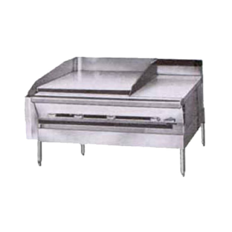 Montague Company C36-1G Legend™ Heavy Duty Range Gas 36" is a powerful kitchen appliance designed for professionals in the food industry, offering a blend of robust construction and efficient functionality. This gas range features a 36-inch width, providing substantial cooking space for diverse culinary needs. It includes a 12-inch griddle on the left, constructed with a 3/4-inch thick plate for excellent heat retention and even cooking, controlled manually for precise temperature adjustments. The right side of the range is equipped with two 12-inch gradient heat hot tops, which deliver variable heat zones ideal for different cooking requirements. The unit's design includes a stainless steel front and a 4-inch flue riser, enhancing its durability and ease of maintenance, while the black sides add a sleek, professional appearance. With adjustable 4-inch high legs, the range offers flexibility in counter height, ensuring ergonomic comfort during use. The gas range operates at 52,000 BTU, highlighting its powerful cooking capabilities. Certified by NSF, cETLus, and CE, the Montague Company C36-1G is a reliable and compliant choice for commercial kitchens seeking to enhance their cooking efficiency and capacity with a heavy-duty appliance.