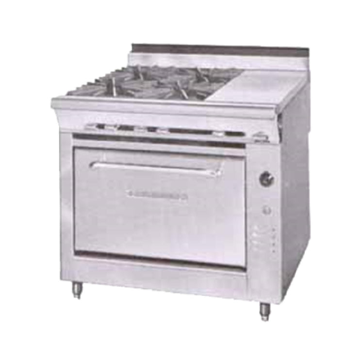 The Montague Company C36-2G Legend™ Heavy Duty Range - Gas - 36" is a powerful cooking solution designed for high-demand commercial kitchens requiring reliable performance. Featuring four 12-inch open burners on the left, each generating 30,000 BTU, this range ensures efficient and high-temperature cooking, perfect for fast-paced environments. On the right, a 12-inch gradient heat hot top allows for versatile cooking applications, catering to diverse culinary requirements. Constructed with a durable stainless steel front and a 4-inch flue riser, this range combines robust design with functionality. The black sides add a sleek aesthetic, while the 4-inch high adjustable legs offer stability and customization to fit various kitchen setups. With a total output of 138,500 BTU, this range is a powerhouse, meeting the rigorous demands of busy restaurants, catering services, and institutional kitchens. Certified by NSF, cETLus, and CE, the C36-2G meets high standards for safety and sanitation, making it a reliable choice for professionals. Whether used in large-scale food production or specialty cooking, this heavy-duty range provides the necessary features to support exceptional culinary outcomes across multiple segment markets within the industry.