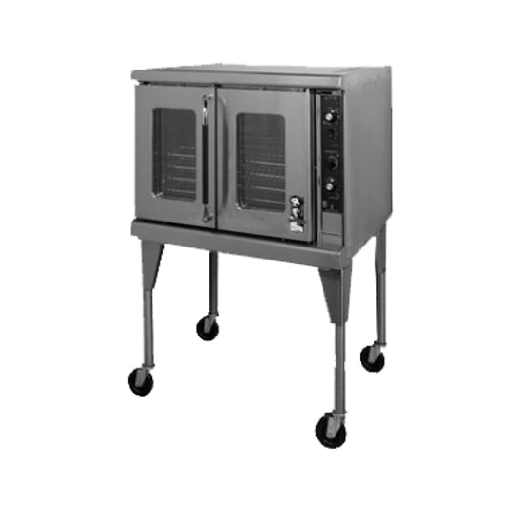 The Montague Company EK12A Vectaire Convection Oven - Electric Full-size Single-deck is a sophisticated appliance engineered for efficiency and versatility in commercial kitchens. With its standard depth and robust 12.0kW power output, this oven addresses the demanding needs of professional chefs and catering businesses. The oven features thermostatic controls accompanied by a 60-minute timer, providing precise heat management for a variety of cooking requirements. Its two-speed motor enhances performance, offering flexibility for different cooking tasks, whether it's baking, roasting, or warming. The vertical opening doors, equipped with windows, allow for convenient monitoring of the cooking process without interrupting the cooking environment. The oven’s exterior boasts a stainless steel front, sides, and top, while the remaining exterior is finished in black, lending a sleek and professional appearance. The 24-inch black gusset legs provide stability and durability, ensuring the oven stands firm even during intensive use. Certified by NSF and cULus, this convection oven meets rigorous health and safety standards, making it a reliable choice for various segments within the food service industry, from restaurants to catering services. The Montague EK12A is designed to deliver consistent results and long-lasting performance, aligning with the high standards expected in professional culinary environments.