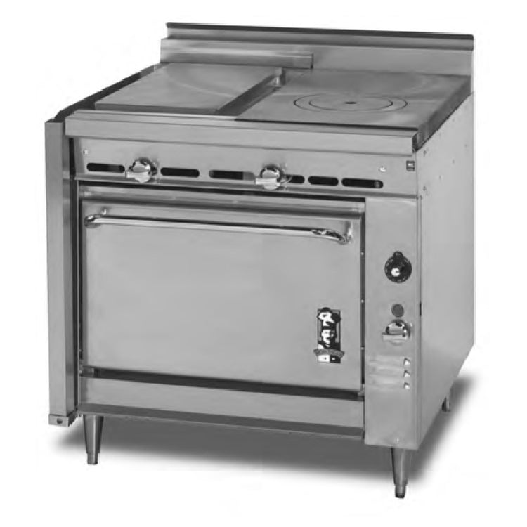 The Montague Company V136-12PL Legend™ Heavy Duty Range is a robust 36-inch gas-powered unit that combines versatility with durability, making it a standout choice in commercial cooking environments. This range features an 18-inch plancha top on the left, boasting a solid 3/4-inch thickness, ideal for creating a variety of grilled dishes. On the right, an 18-inch ring/cover hot top provides an additional cooking surface, enhancing its multifunctional capabilities. Beneath this, a convection oven base offers consistent and even baking results, making it a valuable asset in busy kitchens. The range is engineered with a stainless steel front and a 4-inch flue riser, ensuring longevity and ease of maintenance, while its black sides add a sleek, professional aesthetic. Supported by 6-inch high adjustable stainless steel legs, this unit is designed for stability and adaptability to varying kitchen setups. With a powerful output of 90,000 BTU, it guarantees efficient performance in high-demand settings. Certified by NSF, cETLus, and CE, this heavy-duty range adheres to rigorous safety and quality standards. The Montague Company V136-12PL is a reliable, high-performance cooking solution tailored for diverse culinary enterprises seeking advanced cooking technology and durability.