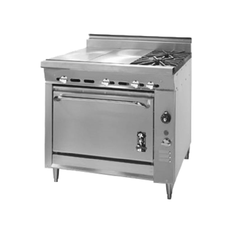 The Montague Company V136-3E Legend™ Heavy Duty Range - gas, 36" is a powerful and versatile kitchen appliance designed for demanding commercial environments. This gas range combines two 12" even heat hot tops on the left, and two 12" open burners on the right, each capable of delivering 30,000 BTU, making it ideal for high-efficiency cooking. Its convection oven base enhances functionality by providing uniform baking and roasting capabilities, supported by a total energy input of 140,000 BTU. The unit boasts a stainless steel front and a 4" flue riser, ensuring durability and easy maintenance, while the black sides offer a sleek aesthetic. The 6" high adjustable stainless steel legs provide stability and adaptability to different kitchen setups. Certified by NSF, cETLus, and CE, this range meets stringent health, safety, and environmental standards. The Montague Company V136-3E Legend™ Heavy Duty Range is an excellent choice for professional chefs and restaurant owners looking for reliability and performance, catering to varied market segments within the foodservice industry.