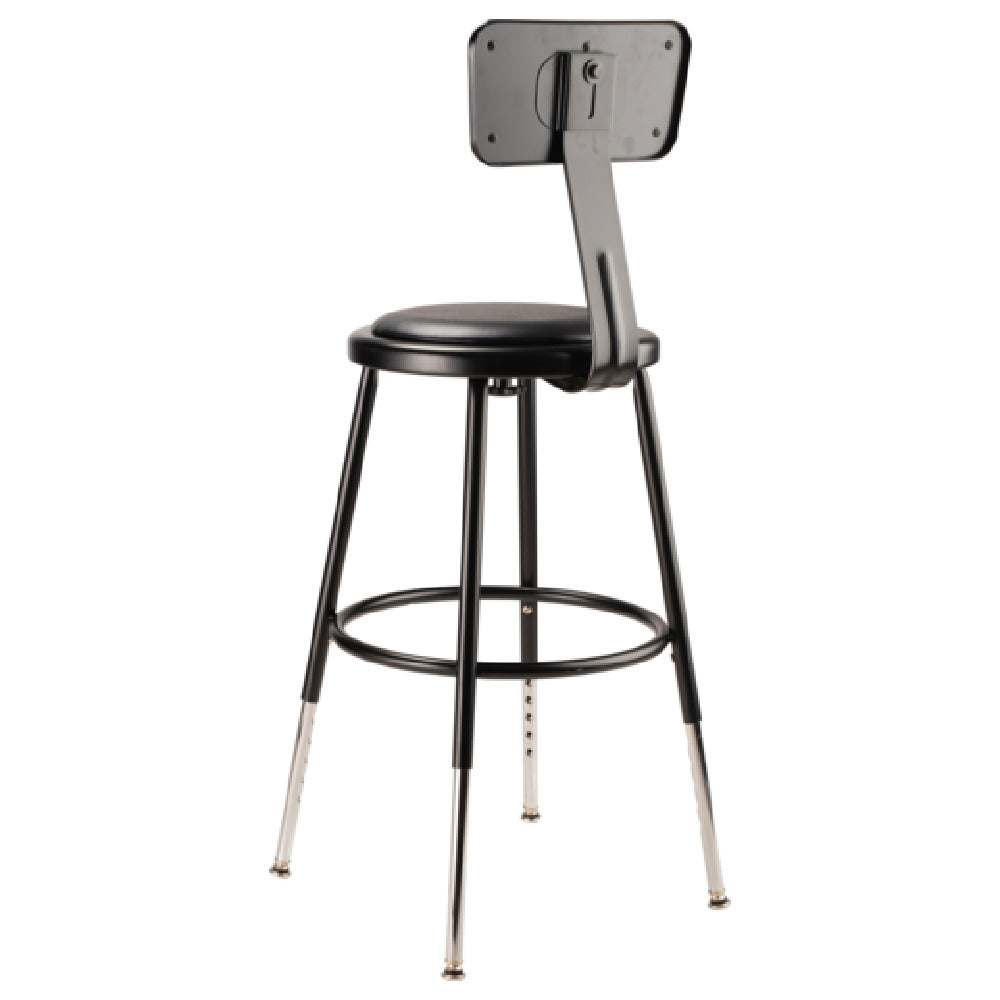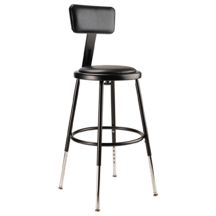 National Public Seating, 6418HB-10, NPS® Heavy Duty Steel Stool with Backrest, 19"-27", Height Adjustable Black, 14" round seat with 11-1/2" dia. vinyl padding, 7/8" O.D. 18-gauge steel frame, 5/8" O.D. foot ring, ANSI/BIFMA, MAS Green Certified