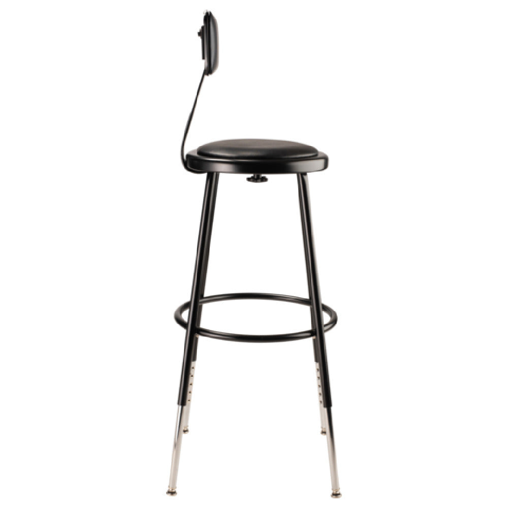 National Public Seating, 6424HB-10, NPS® Heavy Duty Steel Stool with Backrest, 25"-33", Height Adjustable, Black, 14" round seat with 11-1/2" dia. vinyl padding, 7/8" O.D. 18-gauge steel frame, 5/8" O.D. foot ring, ANSI/BIFMA, MAS Green Certified