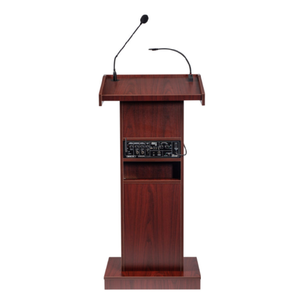 National Public Seating, 800X-MY, Oklahoma Sound® Orator Lectern, 22"W x 17"D x 46"H, inset 12" x 4" shelf, surface mounted halogen lamp, surface mounted gooseneck microphone, built-in amplifier & speakers, inputs for USB, bluetooth & AUX, outputs for extension speakers & recording devices, scratch resistant laminate with MDF core, (4) concealed casters (quick ship)