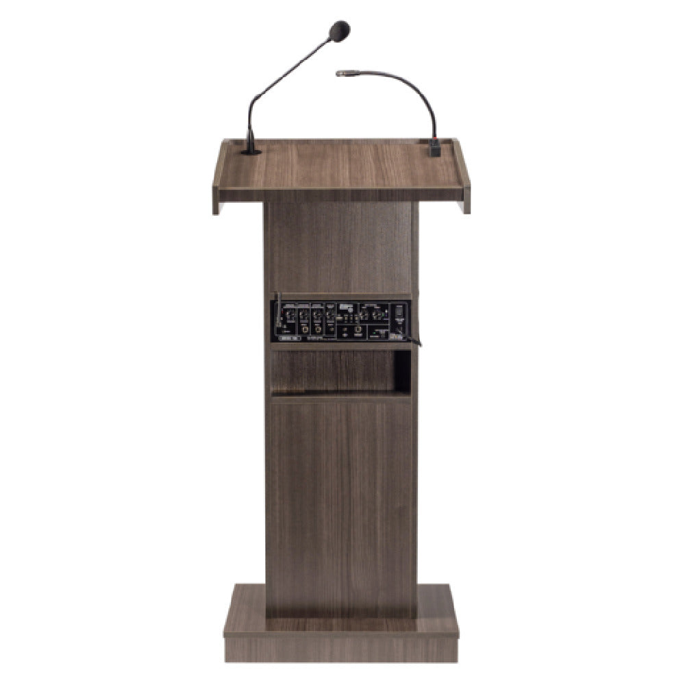National Public Seating, 800X-RW, Oklahoma Sound® Orator Lectern, 22"W x 17"D x 46"H, inset 12" x 4" shelf, surface mounted halogen lamp, surface mounted gooseneck microphone, built-in amplifier & speakers, inputs for USB, bluetooth & AUX, outputs for extension speakers & recording devices, scratch resistant laminate with MDF core, (4) concealed casters (quick ship)