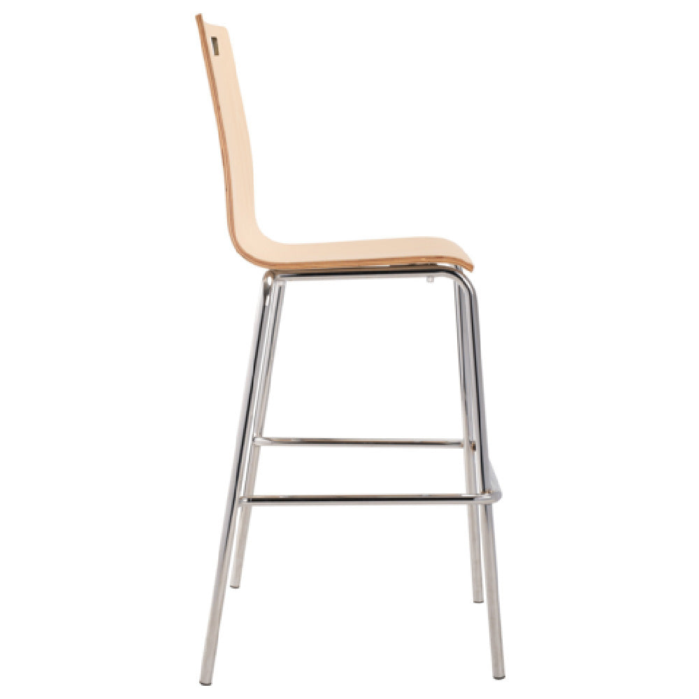 National Public Seating, BCS22, NPS® Bushwick Stack Café Barstool, 500 lb. weight capacity, 1/2" think 8 layer bent HPL laminated plywood back and seat, contoured waterfall edge, side handle on back, 7/8" 16 gauge chromed steel tubing, welded foot ring, non-marring polypropylene glides, ANSI/BIFMA, MAS Green Certified (Quick-Ship)